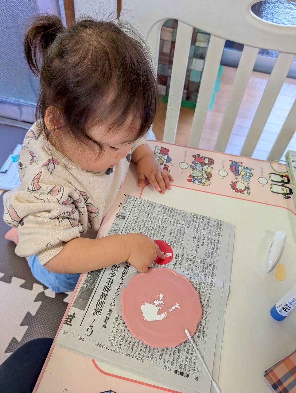 絵の具の感触やスタンプする楽しさをじっくり味わえるように、一人ずつ順番に取り組みました!