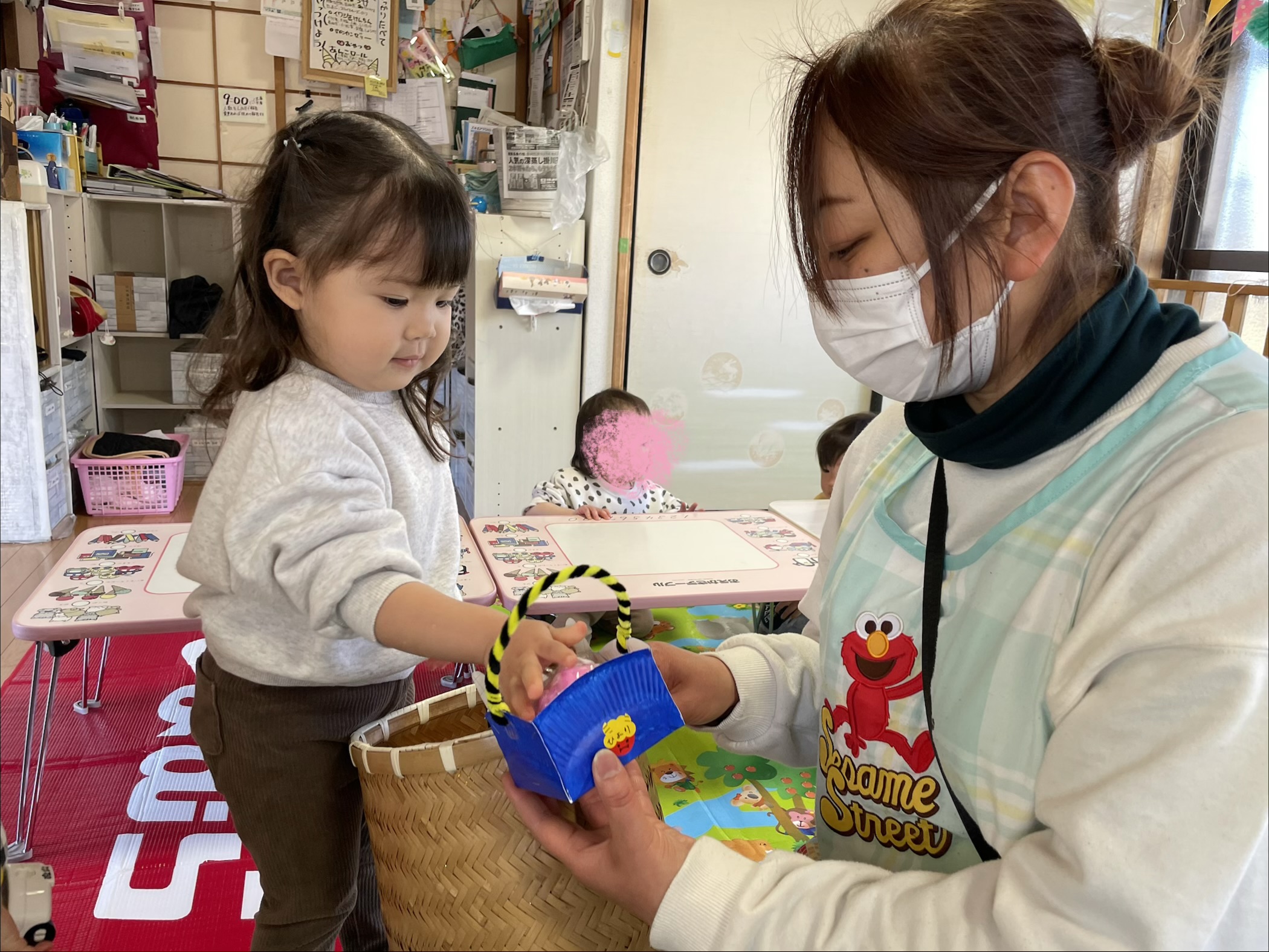 興味が湧くように、豆まきの絵本を読んで、みんなで『豆まきの歌』を歌って、いざ豆まきへ✨